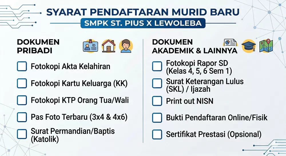 Untuk mendaftar sebagai murid baru di SMPK St. Pius X Lewoleba, terdapat sejumlah persyaratan dokumen administrasi yang umumnya wajib disiapkan oleh calon siswa dan orang tua. Persyaratan ini merupakan standar untuk penerimaan peserta didik baru (PPDB) di sekolah menengah pertama, khususnya di sekolah swasta Katolik.